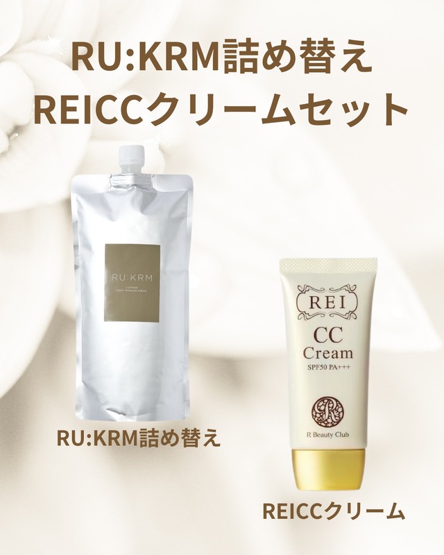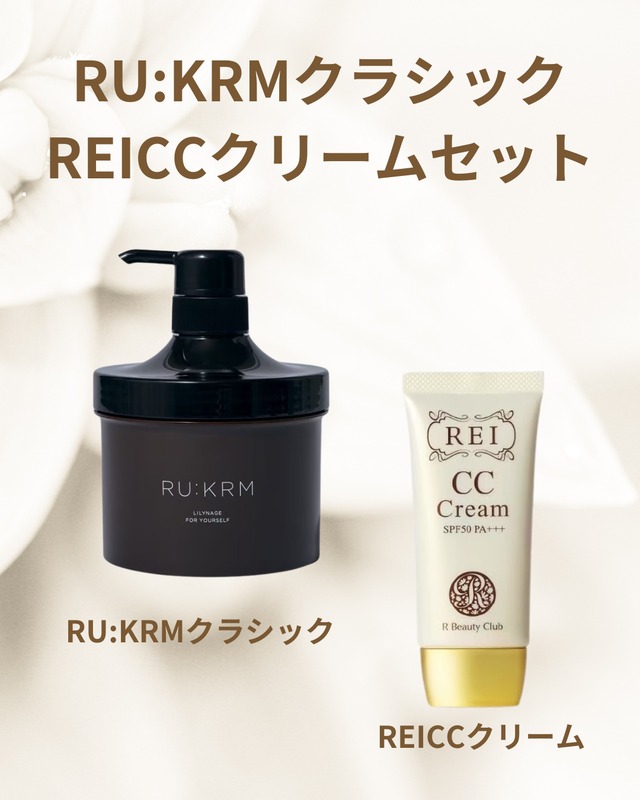 RU:KRMクラシックとREICCクリームのセット 〜詳細〜 RU:KRM ボディマッサージクリーム (クラシック) ( 内容量:500g。全身マッサージ約40回分。) ふれる、きづく、めでる、ゆるむ <セルフマッサージ専用クリーム> 柔らかいテクスチャーで心地よく伸び、パール顔料による程よいキラキラ感のあるクリームが、マッサージによりメリハリがついた身体を、より美しい肌*に魅せてくれるよう導きます。(※メイクアップ効果による) 植物性スリミング素材で、超音波的効果で気になる部分へアプローチするフィトソニック(※1)と、疲れや年齢による、むくみ・くすみへのアプローチが期待できるキュアパッション(※2)。 マッサージと併用することでデトックス効果が期待できる成分配合。 『地球も愛でる』容器はボトルタイプで使いやすく、クリームが少なくなってきたら蓋を開けてジャータイプに。 最後までご使用いただけます。 クリームの艶やかさと、ゼラニウムとベルガモットの心地よい香りが穏やかにあなたを包みます。 何度も触りたくなるような、確かめたくなるような、あなたのためのクリーム。 (※1)フィトソニック:ユーグレナエキス(皮膚コンディショニング剤)、カフェイン(皮膚コンディショニング剤)、エタノール(防腐剤)、水(基剤)、ツノゲシ葉エキス(皮膚コンディショニング剤) (※2)キュアパッション:水(基剤)、BG(保湿成分)、クダモノトケイソウ果実エキス(皮膚コンディショニング剤) 【内容量】 500g 1ヶ月分 【日本製】 【ご使用方法】 手のひらに適量を取り、お肌になじませ、やさしくマッサージします。 【ご使用上の注意】 https://shop.lilynage.com/blog/2024/02/02/165717 【ルクルムのよくあるご質問】 https://shop.lilynage.com/blog/2024/02/24/100000 【全成分】 水、ミネラルオイル、コメヌカ油、BG、ワセリン、マカデミア種子油、(アクリル酸ヒドロキシエチル/アクリロイルジメチルタウリンNa)コポリマー、ベルガモット果実油、ニオイテンジクアオイ油、インドナガコショウ果実エキス、ユーグレナエキス、カフェイン、ツノゲシ葉エキス、クダノモトケイソウ果実エキス、EDTA-2Na、キサンタンガム、スクワラン、ポリソルベート60、ジメチコン、マイカ、酸化チタン、ステアリン酸スクロース、メチルパラベン、フェノキシエタノール ※ご使用前に必ずパッチテストを行って、48時間経過をみてください。(パッチテストのやり方はこちら https://shop.lilynage.com/blog/2024/02/19/111347) ※不良・故障品のみ、発送後7日以内であれば承っております。それ以外は、返品返金不可となります。 ※商品購入後のキャンセル、返品と返金はお断りしております。 透明感あふれるツヤ肌メイクに REICC クリーム (SPF50PA+++。内容量:35g。 約5ヶ月~6ヶ月分。) いままでのCCクリームを超える画期的なメイクアップクリーム。 エイジングケア美容成分が贅沢に配合され、塗った瞬間から潤い、 メイクしている時も1日中スキンケアをしてくれる高機能CCクリーム。 日焼け止め・下地・ファンデーションの効果を備えているので、この1本で透明感あふれるツヤ肌メイクに。 色補正効果が高く、肌の凹凸をカバーして、ナチュラルな仕上がりを長時間キープ。 使うほどにお肌を整え、いきいきとした本来の美しいお肌へ導きます。 美容成分に加え、3つの植物エキス(カミレツ花・オウゴン・シコン)を配合。 ≪7つのエイジングケア美容成分≫ 1 yPGA:保湿力、美白、リフトアップ、PHバランス、弾力アップ 2 AC-11:紫外線や酸化物質などで傷んだ肌の細胞を修復 3 レスベラトール:細胞の酸化防止・老化要因を抑制 4 アルプチン:低刺激でメラニン生成を抑制・高い美白効果 5 ヒアルロン酸:角質層の水分量を高める 6 コラーゲン:皮膚の弾力性アップ 7 アロエエキス:ビタミンC含有・シミやソバカスの原因を抑制 【必ずお読みください】 ※使用後2週間以内にお肌にトラブルが出た場合は、商品と引き換えに全額返金いたします。 ※商品購入後の、返品と返金はお断りしております。